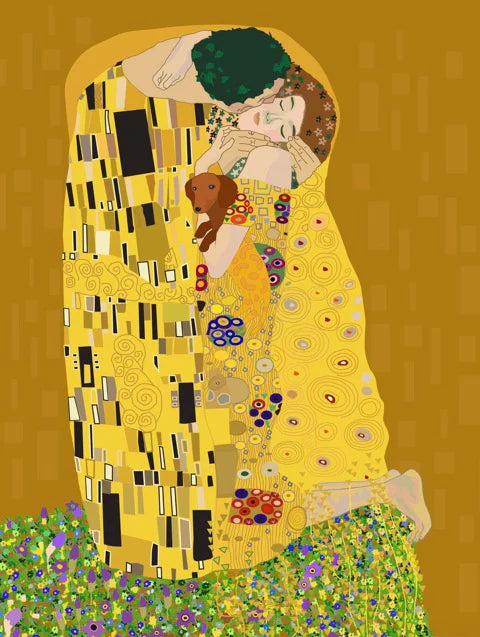 The iconic Klimt’s famous kiss reimagined with a small dachshund in need of a kiss. Dachshund art to delight. Every dachshund home needs this. Available unframed 30 x 40cm