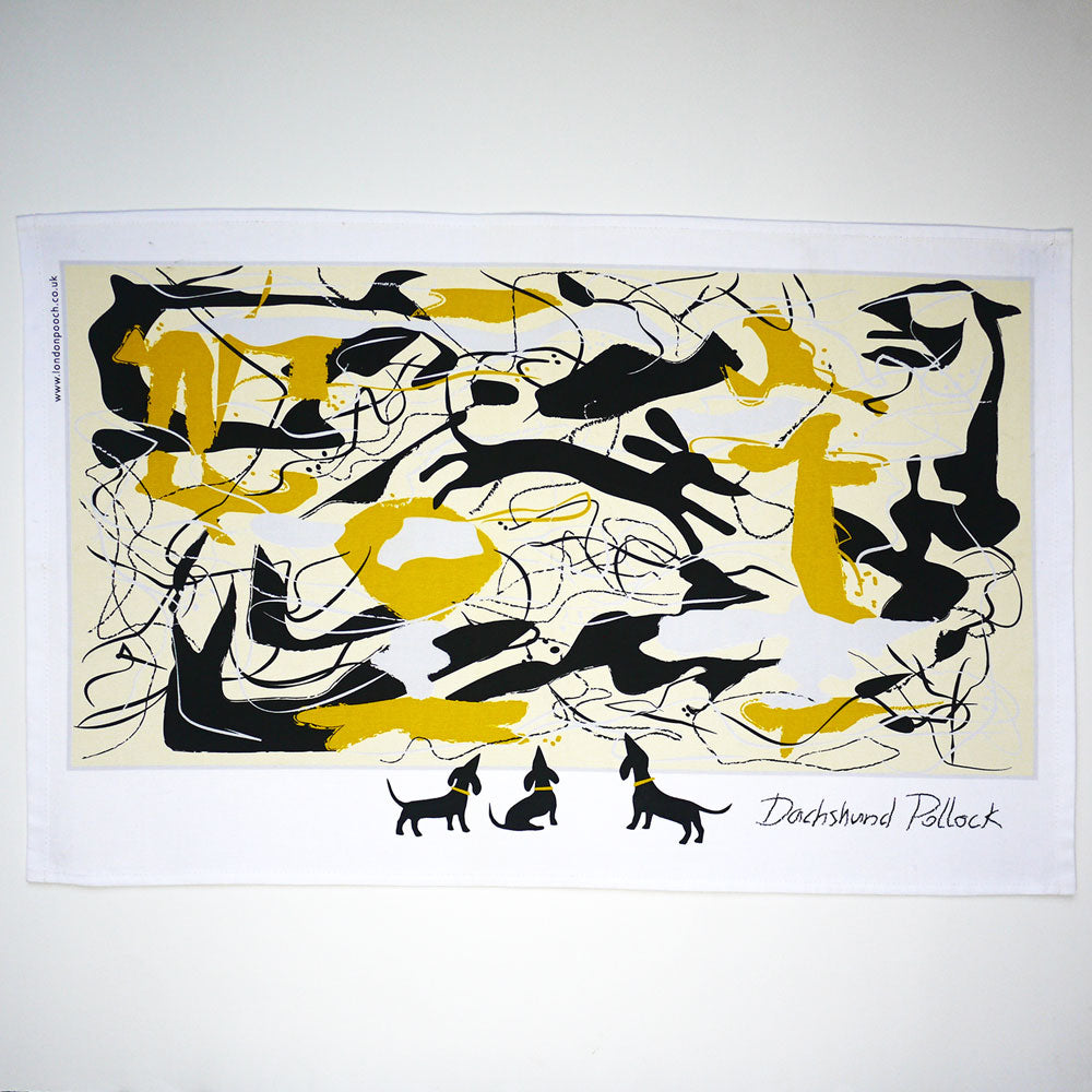 Dachshund Pollock Tea Towel. Will I ever have a better play on words! In homage to our great abstract expressionist Jackson Pollock. Can also be bought with matching card, print and notebook.