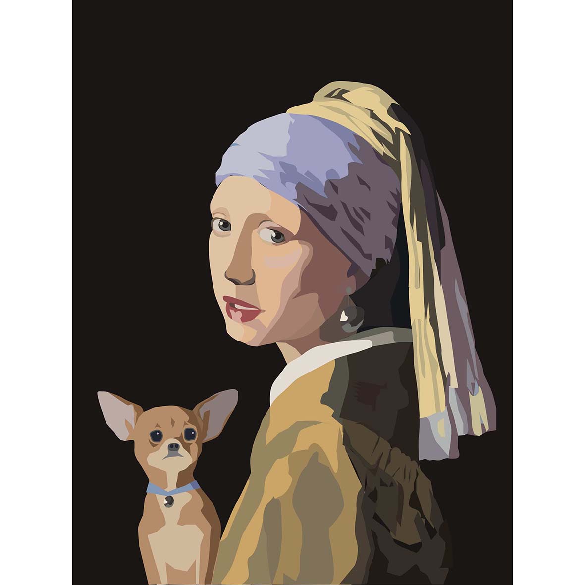 What is this? Not a dachshund! These girls with pearls. This Girl with a Pearl Earring's best friend is a chihuahua with a pearl earring. The Girl with Pearls print comes in one medium size.