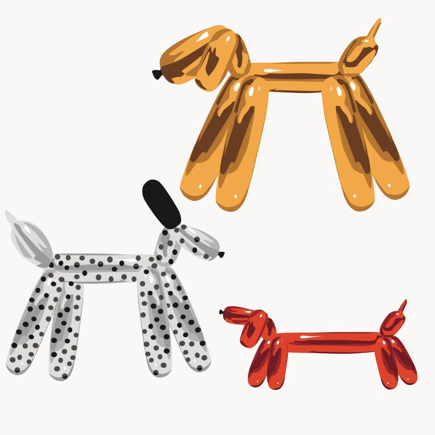 Homage to Jeff Koon's balloon dogs. We see dachshund and dalmation and labrador balloon dogs in their party pack.