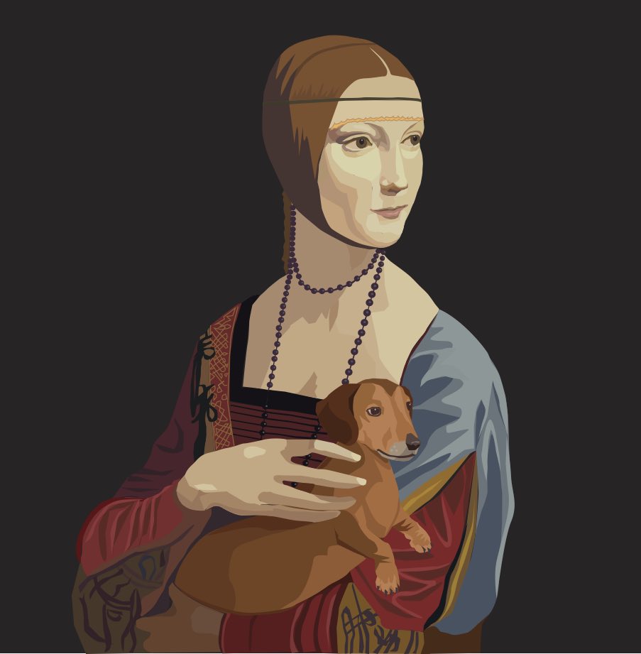 You Mary remember this da Vinci portrait as a Lady with an ermine. Well here she is clutching our handsome dachshund Ned. As Lady with a dachshund it is truly enhanced. Also available as a print.