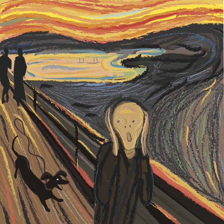 Munch made many paintings of people with scared expressions. Now we know why. Watch out for those ankles. Who wants a Nordic dachshund nip. Homage to the greats.