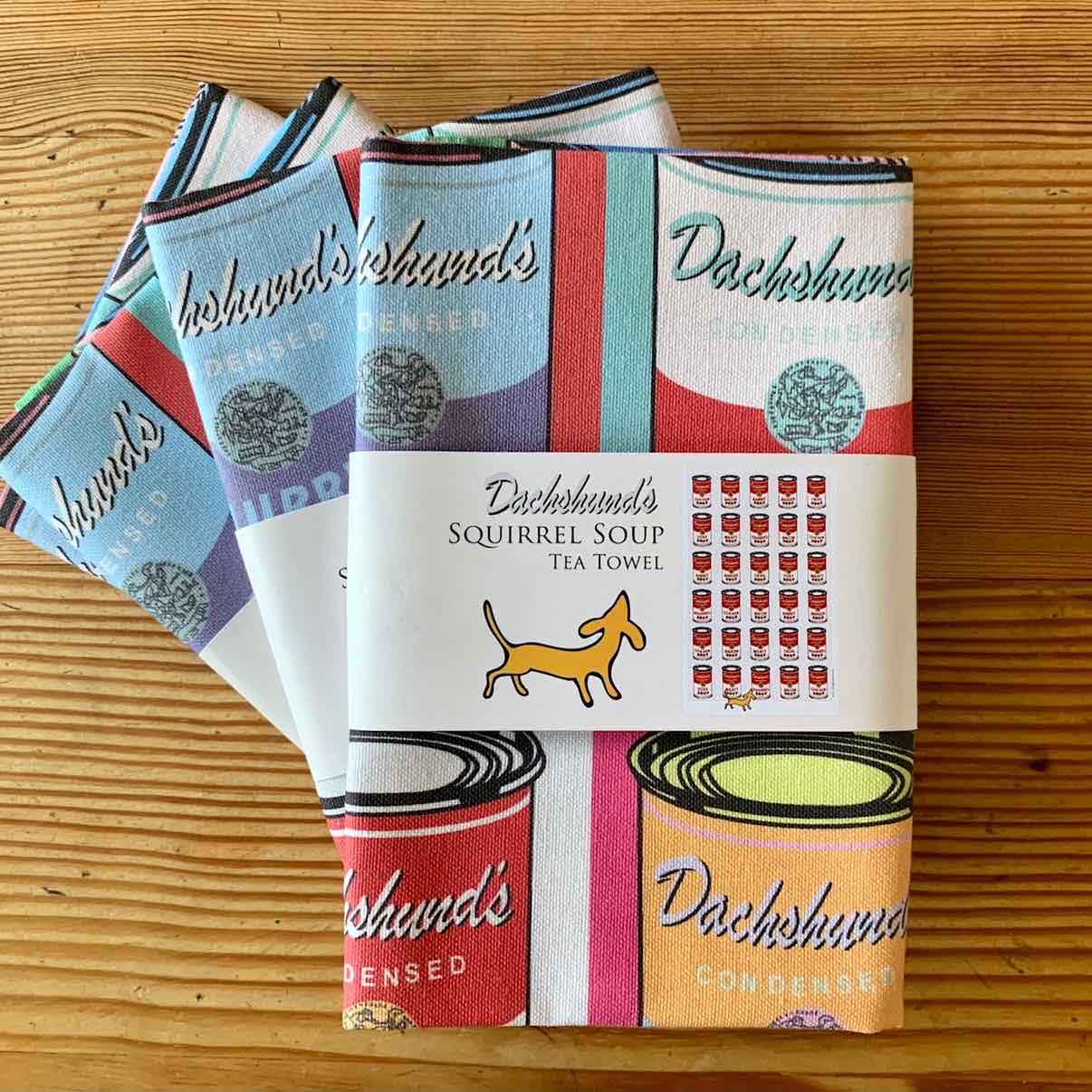 Squirrel Soup Tea Towel. Homage to Warhol's Soup cans. Every dachshunds preferred chase is the squirrel. Can also be bought also with matching card and print.